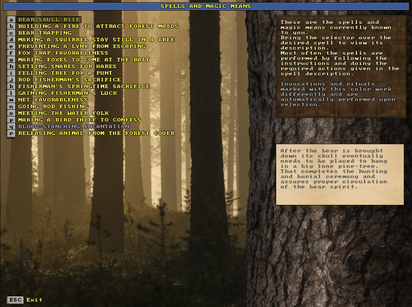 2000Version 2.40--R---------For the library edition CD-ROM lots of additional content was created; music, pictures, short films. This audiovisual material was now used to update graphics, music and sounds of the game - it became rough, harsh, primitive and mystical. Making UrW short films and re-enacting the game had been very inspiring. Bushcrafting and wilderness adventures in real life weren't new thing at all, but the actual programming and concrete feeling of life behind the game now became inseparable. From this version on, more and more game features have been experienced, lived or tested for real. There was new a millenium, a new era in development, and newly found urge to dive deeper and deeper into cultural roots of ancient finns - both personally and in the game. Few unsatisfactory elements that didn't fit the setting still existed: mountain goats (very tough beasts), monetary system, shops, written works, and assortment of "civilized" items. One version was released with additions to nearly every key element of the game; new skills, new rituals, new craftable items, new recipes and so on. Then the doors of development chambers were shut and intense coding started to free the people of Unreal World from money, shops, reading, writing and abundant imported goods...