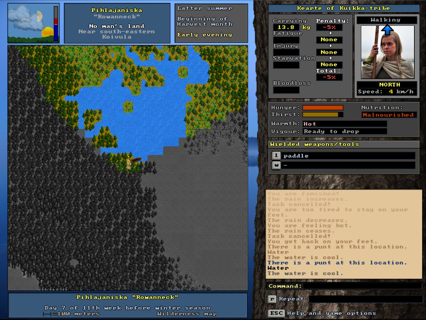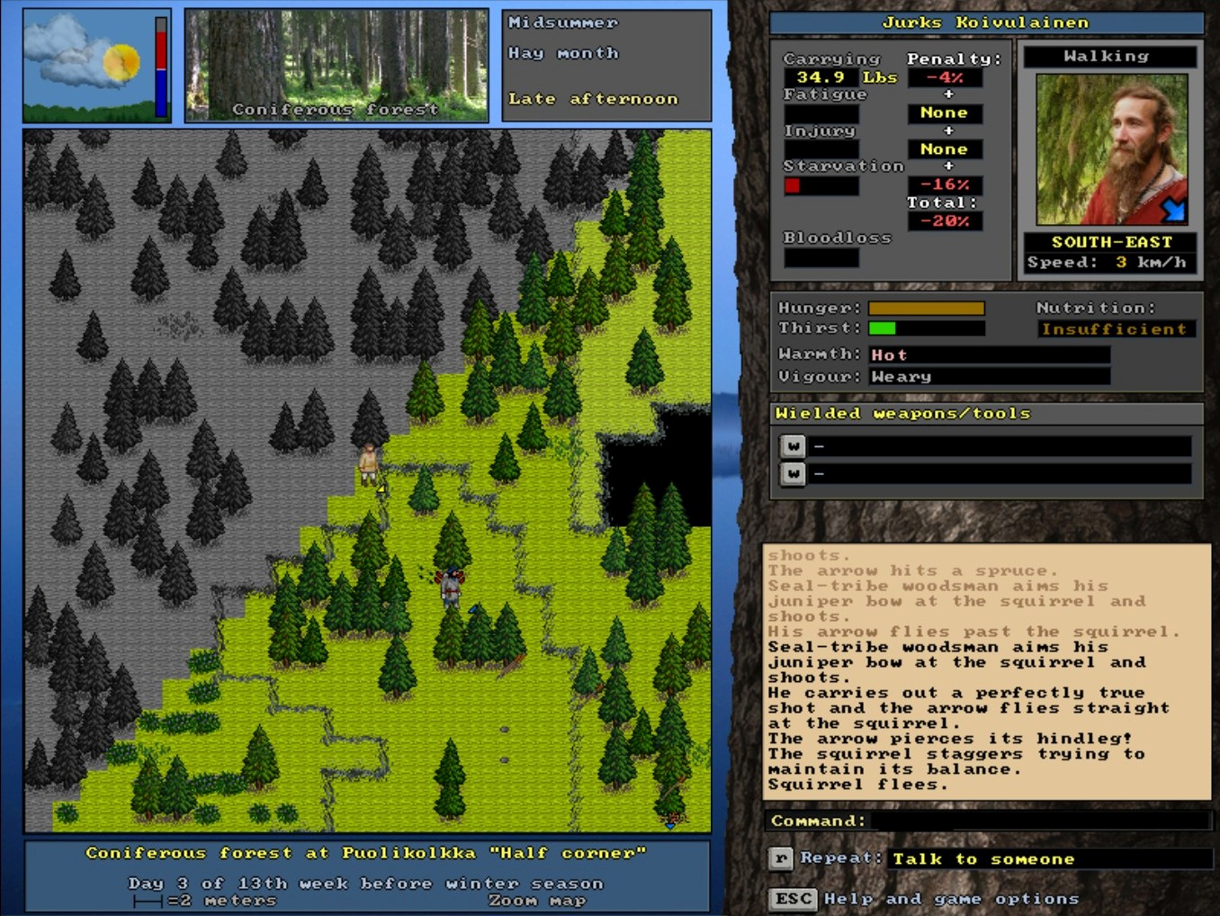 2003no release------------No release doesn't equal to no development. It just took 14 months to finish the next public release. 2004Version 2.80--R---------The game was about iron-age in the far north. Living of the land, hunting, fishing, crafting and building were core elements of the game. Social life was there; getting married, interacting with other human beings and also with the supernatural. But one important source of livelihood had been missing until now: agriculture. This version was clearly focused on agriculture, utilizing crops and preserving food. Life cycle of the plants was improved, cookery recipes were improved, and AGRICULTURE-skill now allowed the character to lead more settled lifestyle.