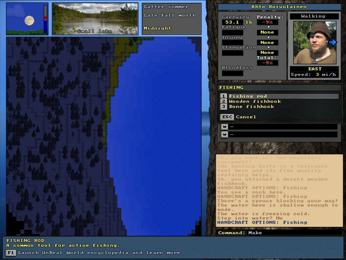 2007Versions 3.00 - 3.04--RRR---R-RWith version 3.00 started the third era of UnReal World. Many elements of the world generation were completely re-written or at least heavily improved. Everything related to landscape became bigger, better, faster and more beautiful. So became completely re-written random world generator, enchanched zoomed-in terrain generation, flora overhaul and map structure overhaul. A fundamental chance from map structure overhaul was that the world became completely seamless; it was now possible to explore the whole world on zoomed-in level. All the mushrooms, wild edible plants and berries were completely re-arranged and re-written, and a bunch of new flora appeared. The new random world generator allowed to create a map from three different regions of the world: Inland, Northern or Archipelago. Cultural areas were also generated on the map for the player to view. Almost all the screens, menus and graphics were re-organized and redrawn.